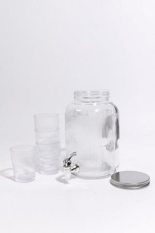 This 5 piece glass beverage dispenser set includes a dispenser and 4 juice glasses. The dispenser holds 3.8 litres